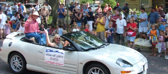 If you’re wondering, Mr. Kooser is the guy relaxing in the back of the drop-top and wearing a hat. The sign on the car reads: "National Poet Laureate Ted Kooser."