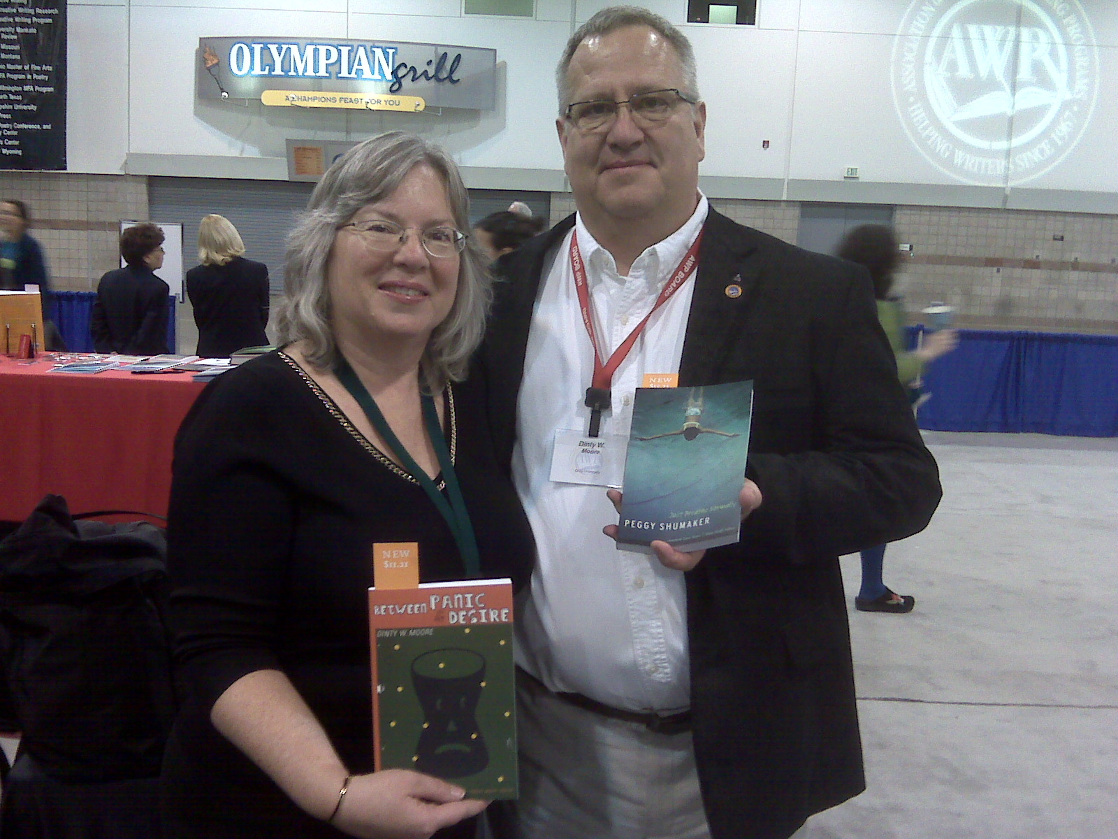 Peggy Shumaker, author of Just Breathe Normally, and Dinty W. Moore, new AWP president and author of Between Panic and Desire, pose with each other's books.