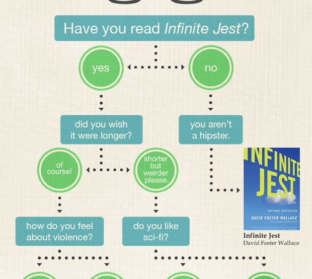 After analyzing the data, and admittedly, taking some editorial liberties, we've determined a few things. The life of the hipster is hard. Between worrying the band you love is about to go big and wondering whether it's finally time to wash your raw denim jeans, you don't have a lot of time to think about what to read next. To make matters worse, now that you've raced through his collected essays, Both Flesh and Not, you've run out of David Foster Wallace books.