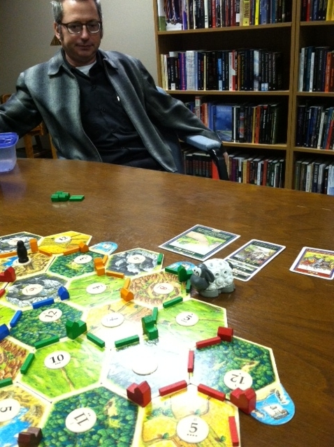 Despite Boldan's unrelenting game play, the game was well matched. Boldan would only win by a small margin. Because of his luck with development cards, the conversation of our rivalry with the UNL Libraries arose. The latter part of the game involved possible strategies to ensure another flawless victory. Said strategies will not be divulged until after our next confrontation with the book-wielding employees of UNL Libraries.