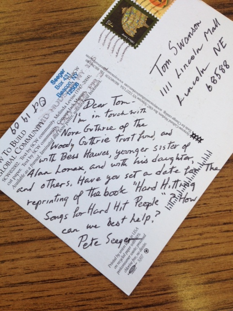 As part of my responsibilities at the Press, I had the chance to work with Pete to reprint the book Hard Hitting Songs for Hard-Hit People, compiled by Alan Lomax. Pete called me on the phone a few times to say that he was proud of the book and felt it was as relevant today as when it first appeared in 1967 and anything he could do to get the book back in print was well worth the effort. Who am I to argue with Pete Seeger, a fixture of the music scene since the 1940s? I did a little research, checked on the book that UNP had originally reprinted several years ago, and agreed to reprint this wonderful book. We wanted Pete to add a little more to the book and he sent along the following: “When Alan Lomax in May 1940 handed Woody and me a big pile of records and union song sheets, and said ‘Why don’t you two make a book out of this?’ we hoped we’d get a book of songs that hardworking folks and their families would like to sing.” He signed the note “Old” Pete Seeger and drew an image of his signature longneck banjo. Is that cool or what? That book, which is selling well, is one project that will always hold a special place.