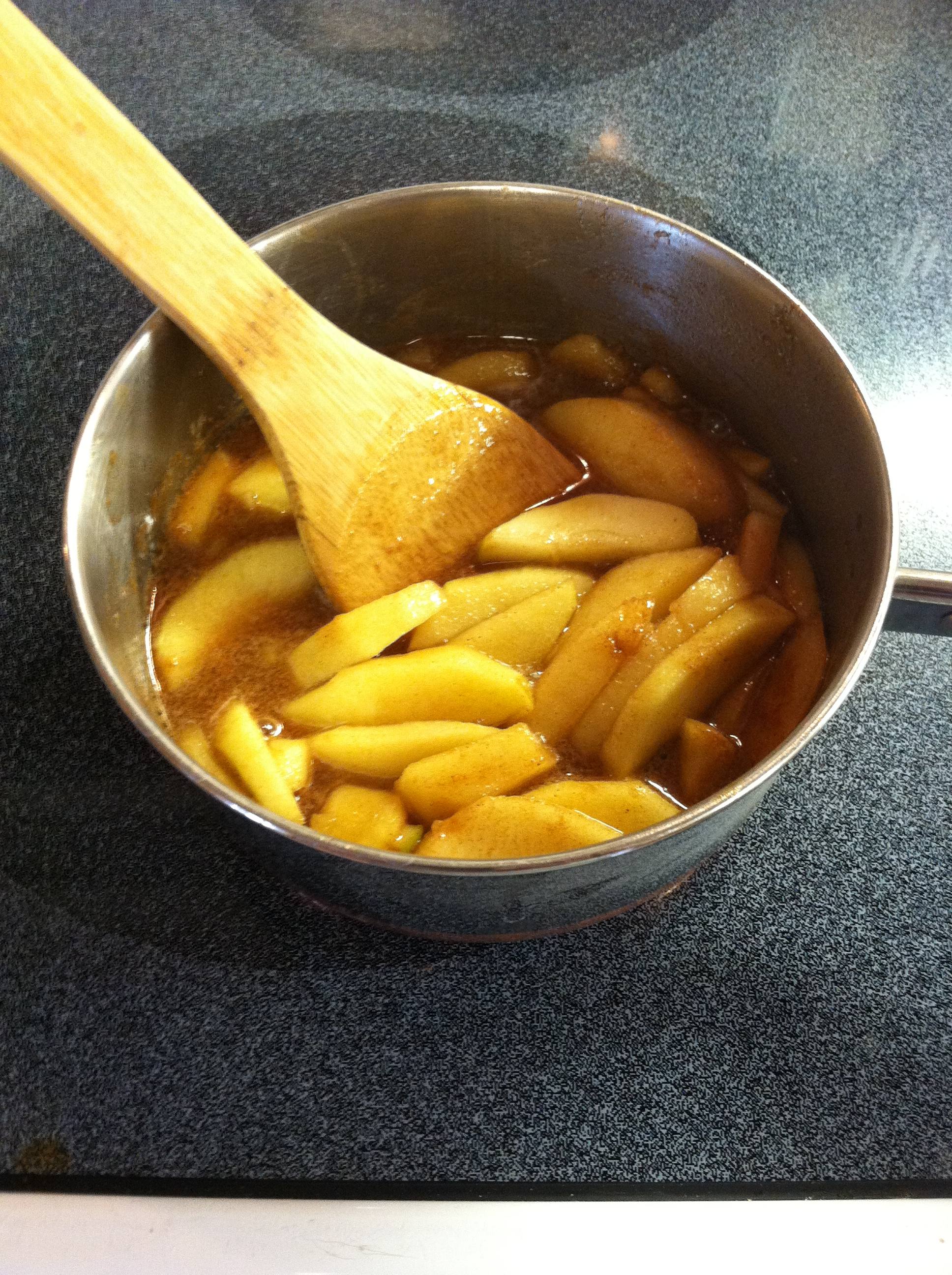 Cook the apples in ½ C water over low heat for five minutes. (They should be gently simmering.) Add the cinnamon, sugar, and butter and cook for two more minutes. Remove from heat and let cool.