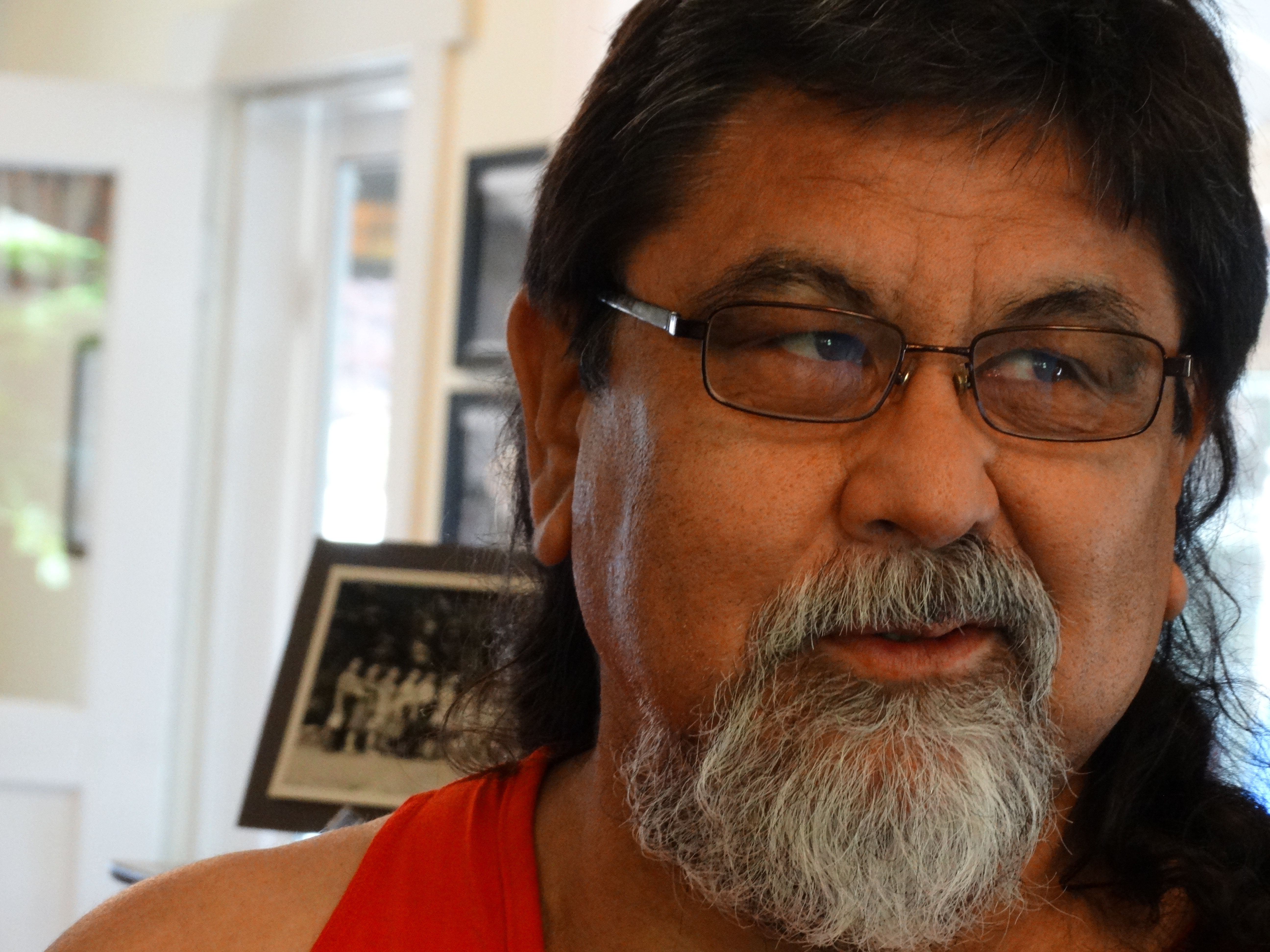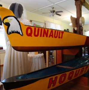 I made a visit to the little museum at Lake Quinault with a friend. James Jr. joined us there. I saw one of only a few photographs that exists of Sally. In the museum, I saw one of only a few photographs that exist of Sally Freeman. Dell Mulkey, a local Grays Harbor photographer, made these images in the 1930s. One is hung above a basketry display. Two of James Sr.’s racing canoes are in the museum too. James Jr. and I admire them and learn about how they were altered and reworked, sometimes not so successfully, for racing. There is a photograph of James Sr. on a shelf beside them. After a while, James Jr. shows me a topographic map of the Olympic Peninsula and uses his fingertip to trace the route his ancestors would have taken up through the river valley, through the Olympic Mountains, all the way to Klallam Bay on the Strait of Juan de Fuca to visit Klallam relatives and friends.