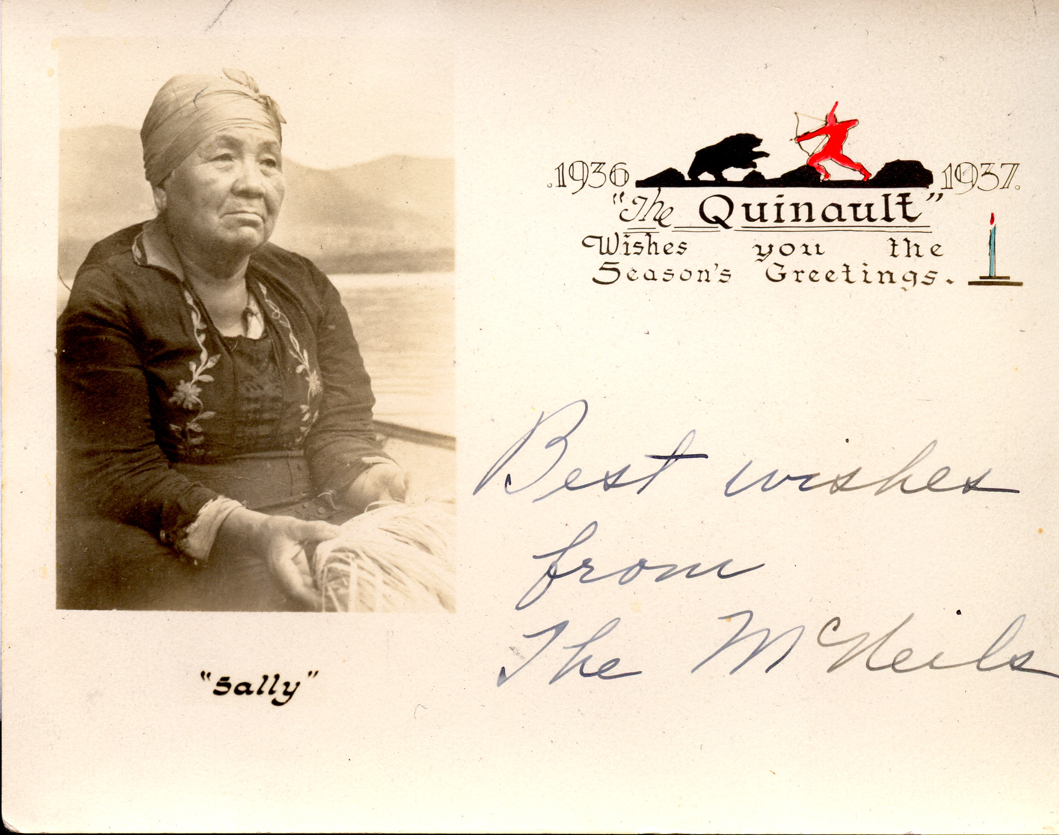 James’s story of Sally Freeman, while wonderful family history, is one that exemplifies the dynamic relationship between and among coastal people and the U.S. government. It is also a story of a burgeoning tourism industry that brought people to enjoy the Olympic wilderness, fish with Quinault guides, buy Indian baskets, and even enjoy the spectacle of story and performance provided by the Quinault people—including Justine James’s forebears—within the cavernous lobby of the splendid Lake Quinault Lodge. Indeed, James’s father and his siblings sang, danced, and drummed for the Lake Quinault Lodge guests and were paid with what money was tossed into a blanket at the end of their performance. James’s father said that Sally Freemanoften sat in the lodge while weaving baskets and talking with tourists. Sally was well known in the area during her lifetime; in fact, she and the lodge owner’s wife were good friends, and she helped to dedicate a new Lake Quinault Lodge in 1926 (built after a fire destroyed the first one), James recalls. A photograph of her, with the note that she “blessed” the lodge, appears in A History of Lake Quinault Lodge by R. H. Jones.1 Sally was also featured on a 1937 Lake Quinault Lodge Christmas card.