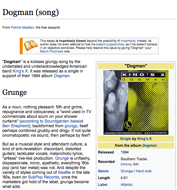 Given so much history with the band over 30 years, and a whole lot of bootlegs, letters, photos, and other memorabilia, I needed some constraints on my essay to give me inspiration and shape. When I checked the Wikipedia page for my assigned song, “Dogman,” and found it to be woefully sparse, I had my eureka! moment. I would write my essay in the form of a Wikipedia article, thus affirming and subverting what such a form could do, suggesting the infinitude of connections, especially as King’s X is often acknowledged by their fellow musicians as foundational and inspirational (Jeff Ament of Pearl Jam has said that “King’s X invented grunge”), even though they never got the fame and fortune that other bands found.