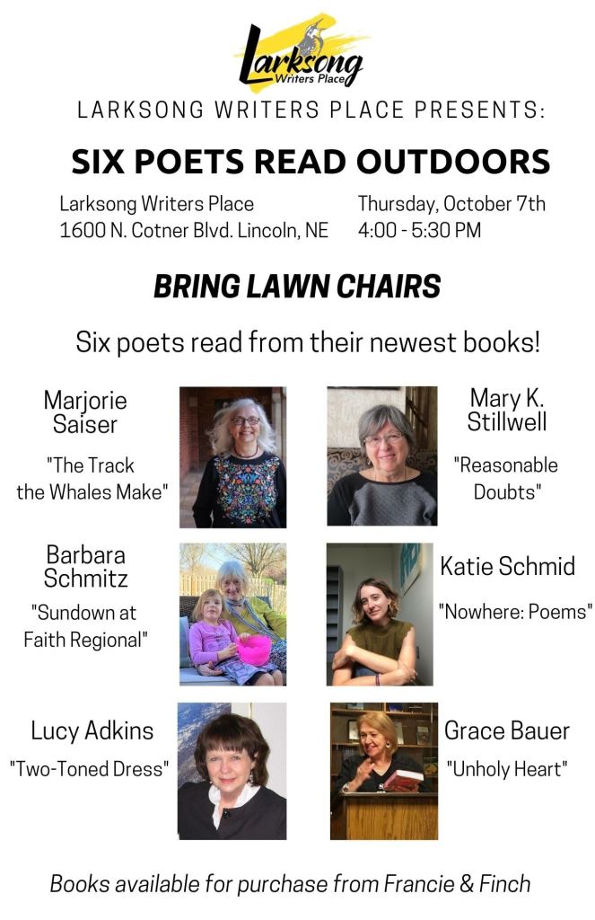 Join Larksong Writers Place for their event 6 Poets Read Outdoors on Thursday, October 7 from 4:00-5:30 p.m. at Larksong Writers Place on 1600 N. Cotner Blvd. Lincoln, NE. Six poets, including Marjorie Saiser and Grace Bauer, will be reading from their newest books! Saiser will be reading an excerpt from The Track the Whales Make (Nebraska, 2021) and Bauer will be reading an excerpt from Unholy Heart (Backwaters Press, 2021).