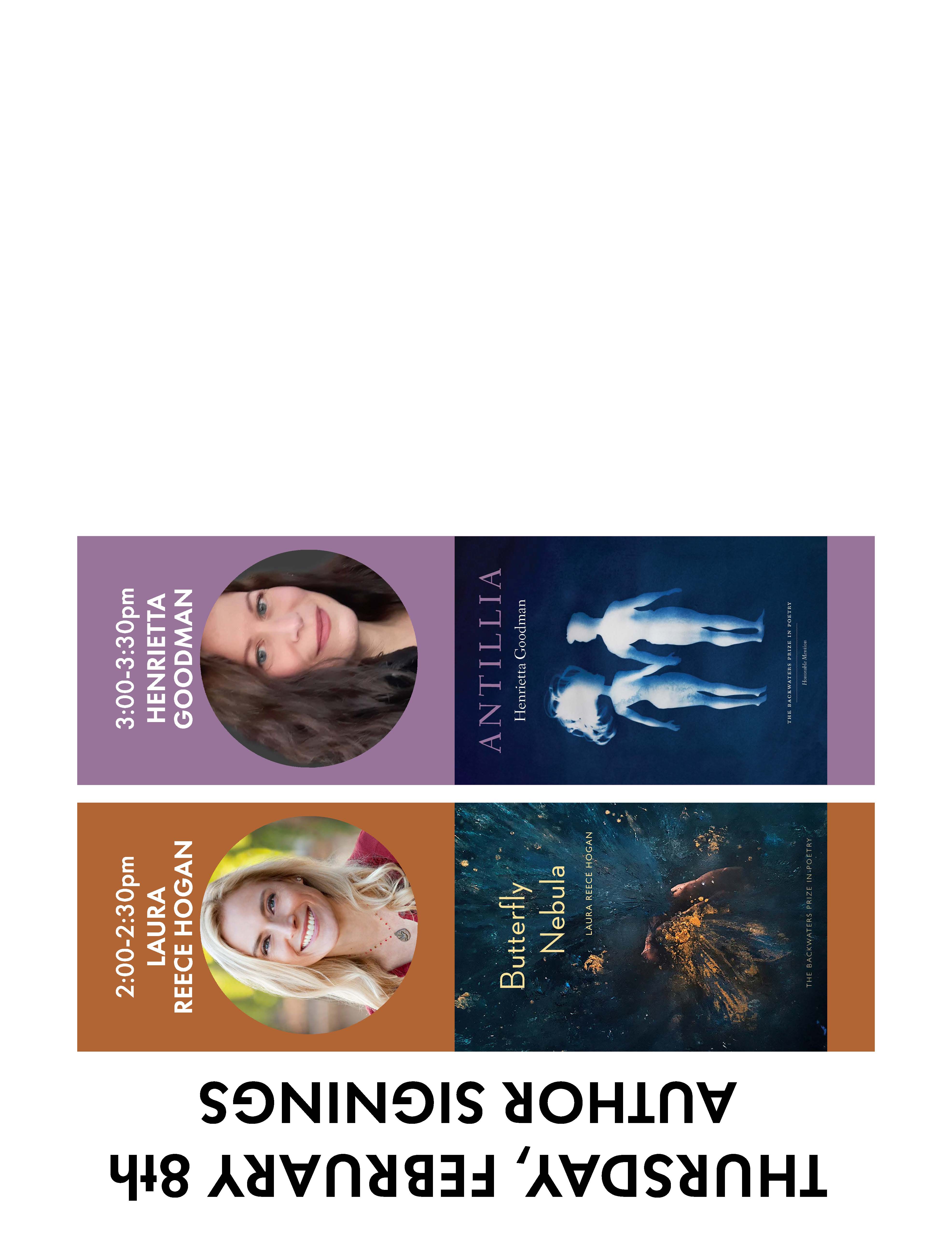 2:00-4:00 p.m. Henrietta Goodman, author of Antillia, Laura Reece Hogan, author of Butterfly Nebula, and Sophie Klahr, author of Two Open Doors in a Field, “Crossroads: A Reading + Open Mic.”