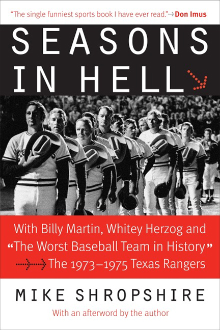 Seasons in Hell (Bison Books, 2005) by Mike Shropshire. Seasons in Hell is a riotous, candid, irreverent behind-the-scenes account in the tradition of The Bronx Zoo and Ball Four, following the Texas Rangers from Whitey Herzog’s reign in 1973 through Billy Martin’s tumultuous tenure. Offering wonderful perspectives on dozens of unique (and likely never-to-be-seen-again) baseball personalities, Seasons in Hell recounts some of the most extreme characters ever to play the game and brings to life the no-holds-barred culture of major league baseball in the mid-seventies.